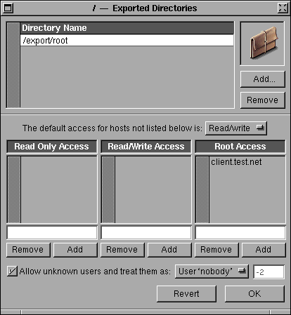 #/etc/exports /export/client/root -root=client.test.net /export/client/swap -root=client.test.net /export/client/usr -access=client.test.net /export/client/home -access=client.test.net