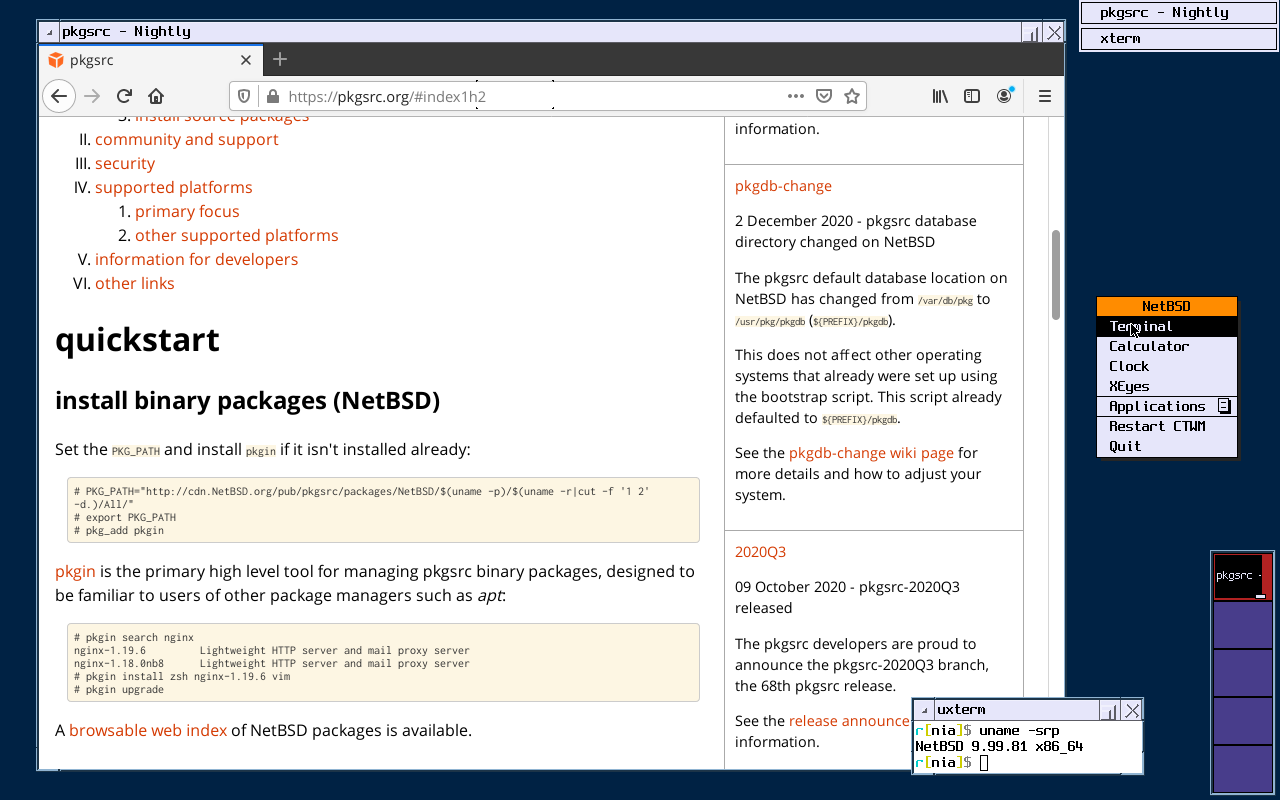 NetBSD's default ctwm(1) graphical environment, with Firefox running, from nia. Note: for uses including illustrating NetBSD, this file is available under CC0