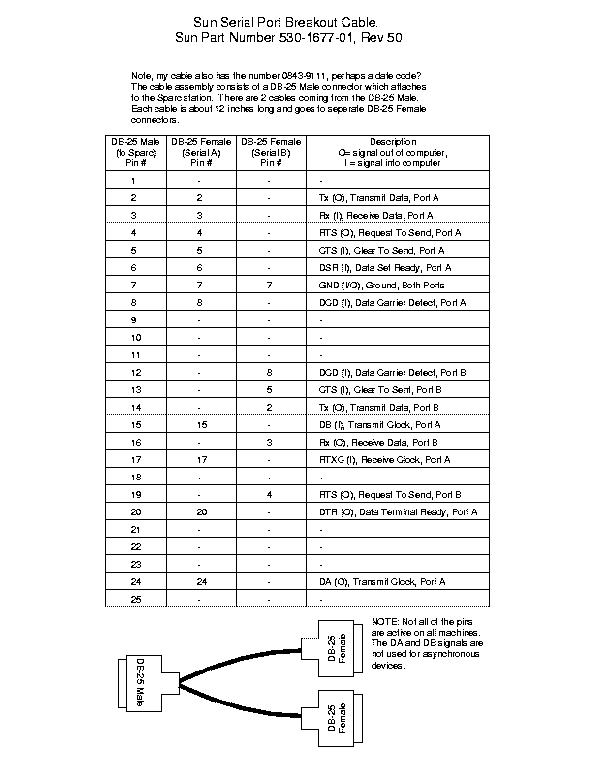 Some sparc machines, such as the SPARCstation 20 and SPARC Classic, have 2 serial ports but use a single DB-25 connector. Serial port A is wired using the standard pin out so that it may be used with a "normal" (whatever that means with serial ports) serial cable. To use serial port B, an adapter cable is required. Dan McMahill has traced the pin out on a Sun P/N 530-1677-01 cable.